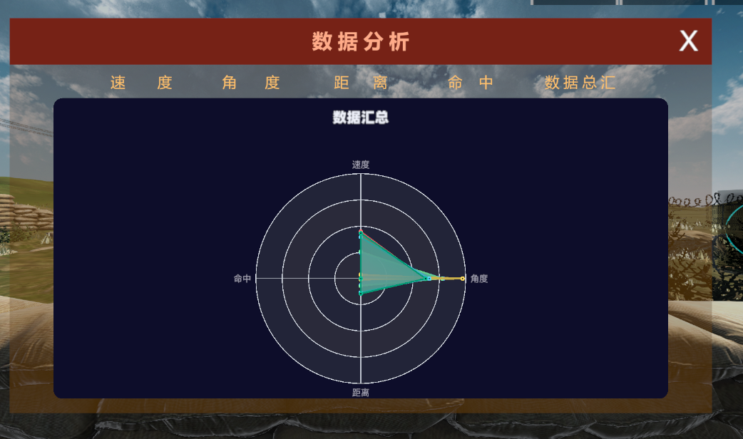 训练结束后,会对当前的投掷信息进行整合,分别为速度、角度、距离、命中。数据总汇中,可以查看众多指标后的综合结果。